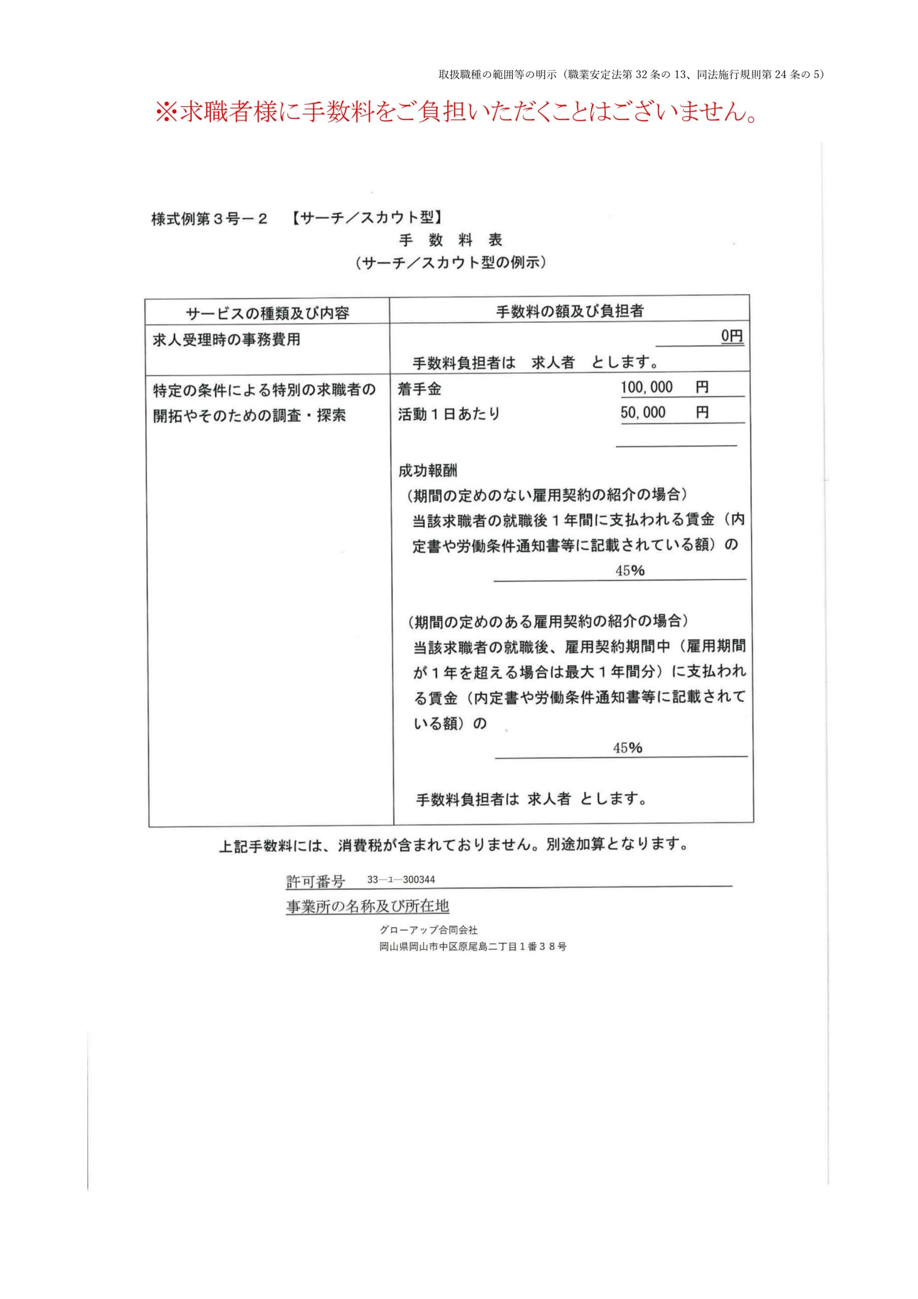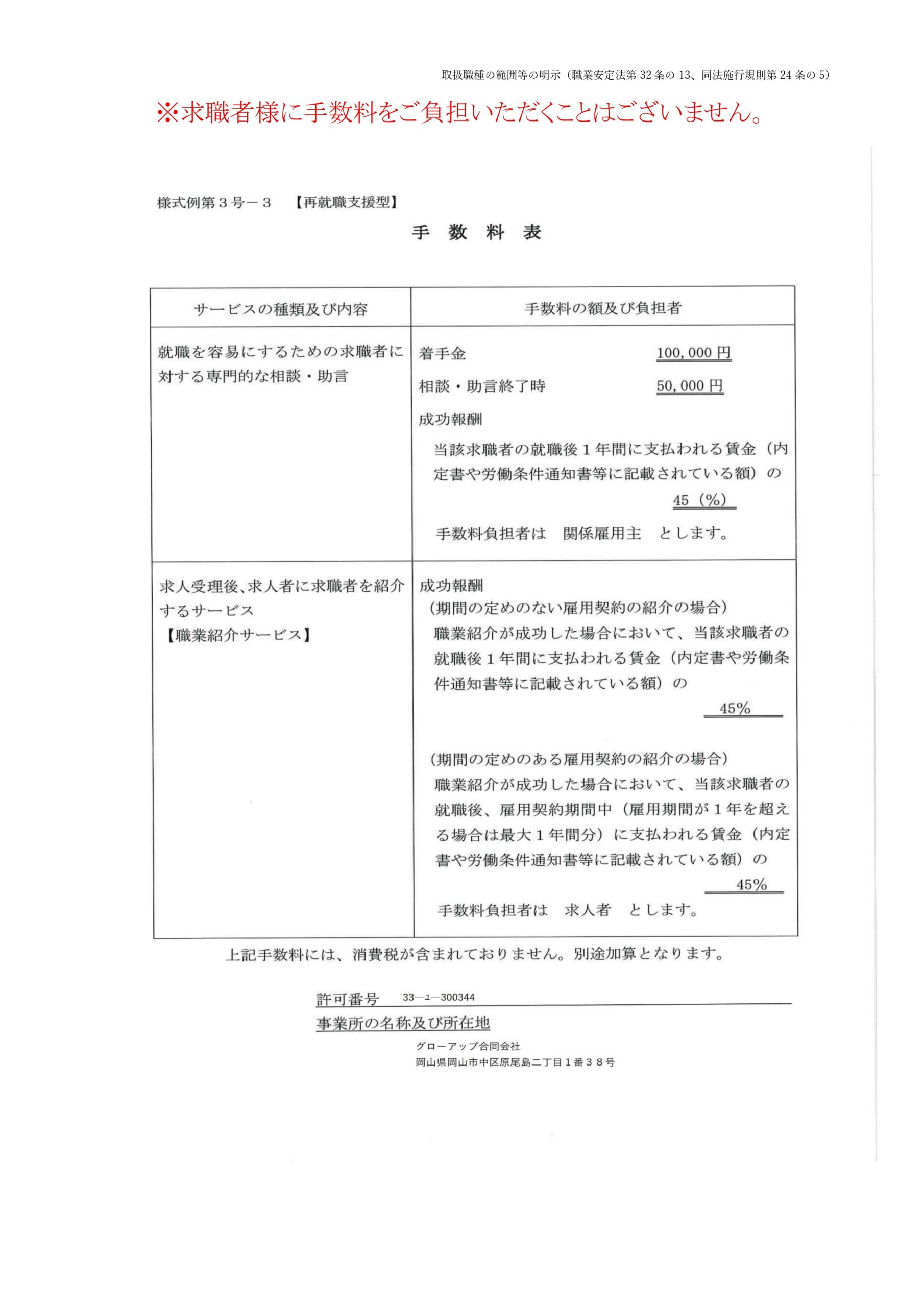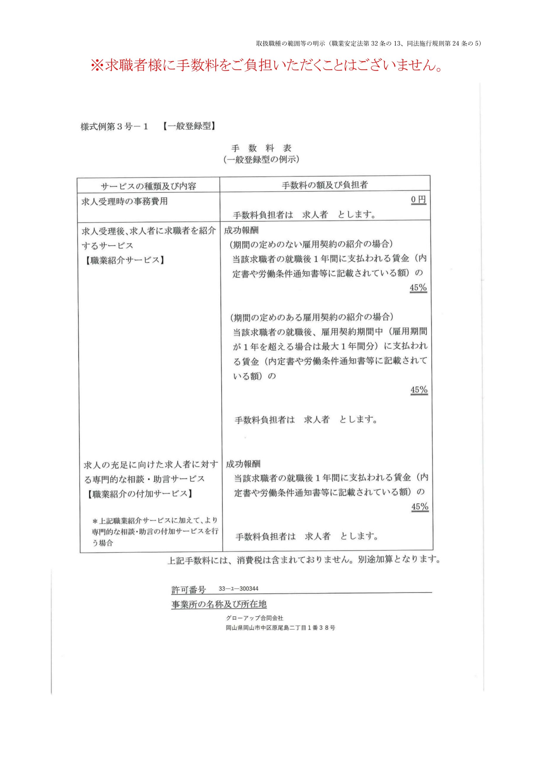 | 業務管理規定 | 第1 求 人 1 本所は、(取扱職種の範囲等)に関する限り、いかなる求人の申し込みについてもこれを受理します。 ただし、その申込みの内容が法令に違反したり、賃金、労働時間等の労働条件が通常の労働条件と比べて著しく不適当である場合には受理しません。 2 求人の申込みは、求人者又はその代理人が直接来所されて、所定の求人票により、お申込みください。直接来所できないときは、郵便、電話、ファクシミリ又は電子メールでも差し支えありません。 3 求人申込みの際には、業務内容、賃金、労働時間、その他の雇用条件をあらかじめ書面の交付又は電子メールの使用により明示してください。ただし、紹介の実施について緊急の必要があるためあらかじめ書面の交付、ファクシミリ又は電子メールの使用による明示ができないときは、当該明示すべき事項をあらかじめこれらの方法以外の方法により明示してください。 4 求人受付の際には、事務費用を、別表の料金表に基づき申し受けます。いったん申し受けました手数料は、紹介の成否にかかわらずお返し致しません。 第2 求 職 1 本所は、(取扱職種の範囲等)に関する限り、いかなる求職の申込みについてもこれを受理します。 ただし、その申込みの内容が法令に違反する場合には受理しません。 2 求職申込みには、本人が直接来所されて、所定の求職票によりお申込みください。 3 常に、日雇的又は臨時的な労働に従事することを希望される方は、本所に特別の登録をしておき、別に定める登録証の提示によって、求職申込みの手続きを省略致します。 第3 紹 介 1 求職の方には、職業安定法第2条にも規定される職業選択の自由の趣旨を踏まえ、その御希望と能力に応ずる職業に速やかに就くことができるよう極力お世話いたします。 2 求人の方には、その御希望に適合する求職者を極力お世話いたします。 3 紹介に際して、求職の方に、紹介において従事することとなる業務の内容、賃金、労働時間その他の雇用条件をあらかじめ書面の交付又は希望される場合にはファクシミリ、電子メール等の使用により明示します。ただし、紹介の実施について緊急の必要があるためあらかじめ書面の交付、ファクシミリ又は電子メールの使用による明示ができないときは、あらかじめそれらの方法以外の方法により明示を行います。 4 求職の方を求人者に紹介する場合には、紹介状を発行しますから、その紹介状を持参して求人者へ行っていただきます。 5 いったん求人、求職の申込みを受けた以上、責任を持って紹介の労をとります。 6 本所は、労働争議に対する中立の立場をとるため、同盟罷業又は作業閉鎖の行われている間は求人者に、紹介を致しません。 7 就職が決定しましたら求人された方から別表の手数料表に基づき、紹介手数料を申し受けます。 第4 そ の 他 1 本所は、職業安定機関及びその他の職業紹介事業者等と連携を図りつつ、当該事業に係る求職者等からの苦情があった場合は、迅速、適切に対応いたします。 2 本所の行った職業紹介の結果については、求人者、求職者両方から本所に対して、その報告をしてください。 また、本所の職業紹介により期間の定めのない労働契約を締結した求職者が就職から6箇月以内に離職(解雇された場合を除く。)したか否かについて、求人者から本所に対して報告してください。 3 本所は、求職者又は求人者から知り得た個人的な情報は個人情報適正管理規程に基づき、適正に取り扱います。 4 本所は、求職者又は求人者に対し、その申込みの受理、面接、指導、紹介等の業務について、人種、国籍、信条、性別、社会的身分、門地、従前の職業、労働組合の組合員であること等を理由として差別的な取扱いは一切致しません。 5 本所の取扱職種の範囲等は、全職種 日本国内全域です。 6 本所の業務の運営に関する規定は、以上のとおりでありますが、本所の業務は、すべて職業安定法関係法令及び通達に基づいて運営されますので、ご不審の点は係員に詳しくおたずねください。 2022年12月12日 代表者 西﨑 ひかる |